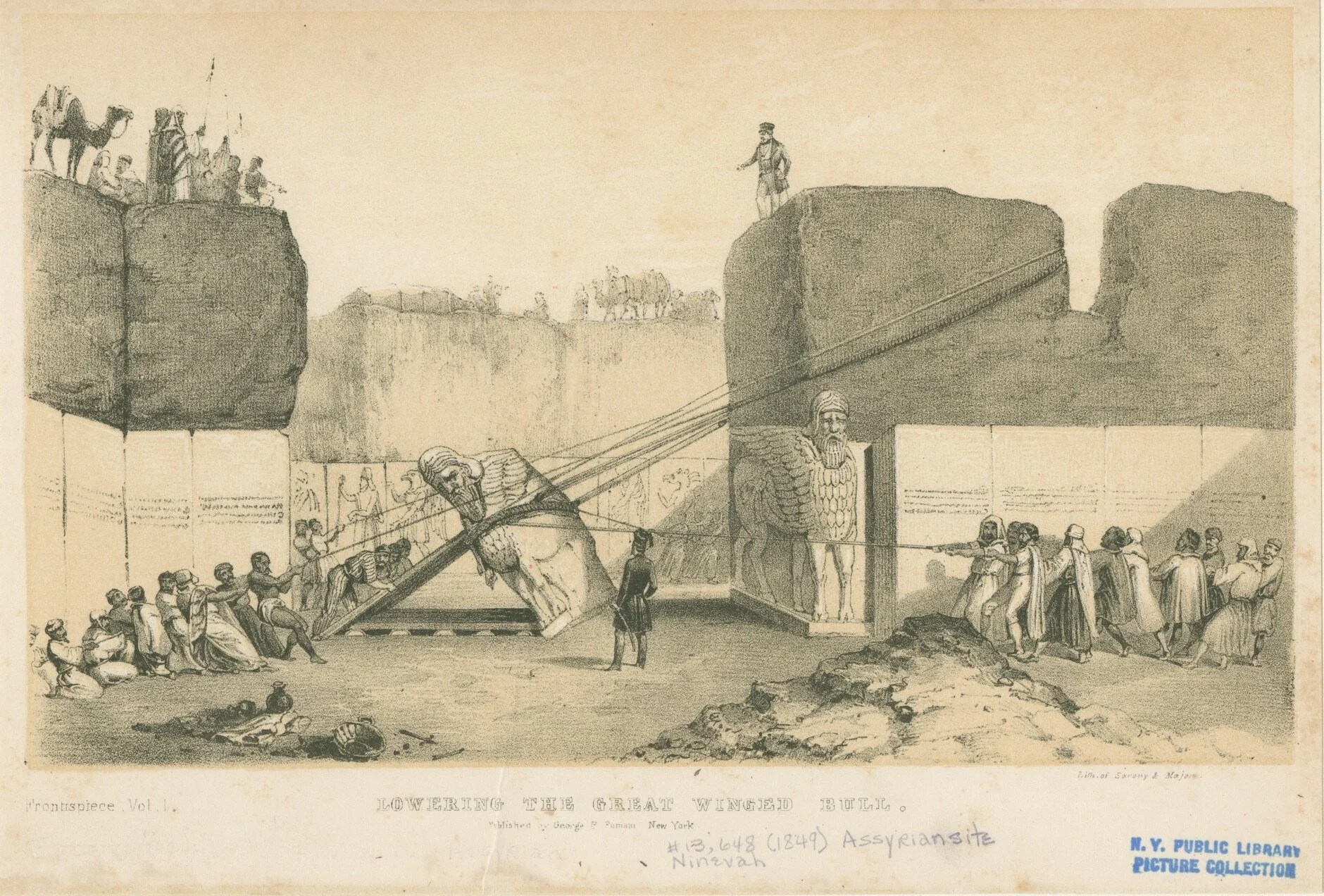 Lowering the Great Winged Bull, lithograph, frontispiece to Austen Henry Layard, Nineveh and Its Remains, (London, 1849), The New Your Public Library, Digital Collections